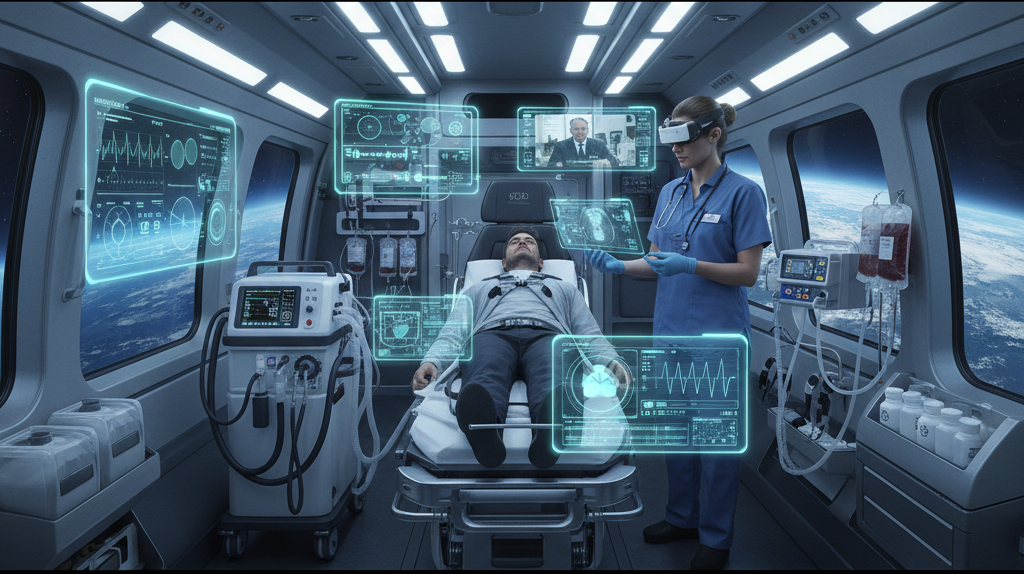Critical trauma care is supported through whole blood administration, onboard storage, and specialized hemorrhage-control systems. Real-time monitoring—cardiac, hemodynamic, and diagnostic—is paired with telemedicine connectivity, allowing live video consultation, data transmission to receiving hospitals, 3D assessment, and continuous remote specialist oversight.